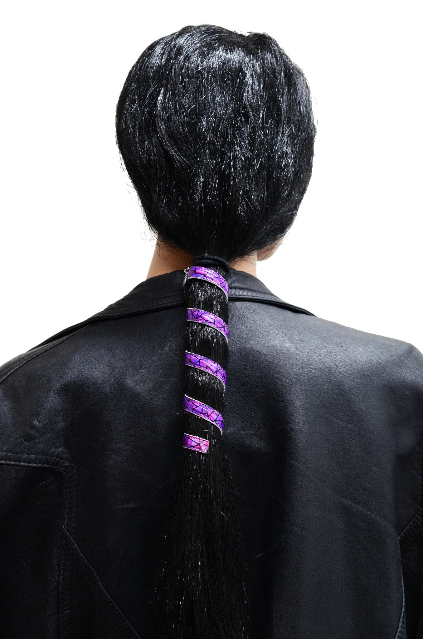 Deep color, dazzling shine. The Dark Purple Holographic Ponytail Wrap by Medieval Metal is a striking 6-inch faux leather Hair Twister designed to add rich color and shimmer to your style. Perfect for ponytails or braids, this wrap delivers bold, festival-ready flair with an elegant twist.