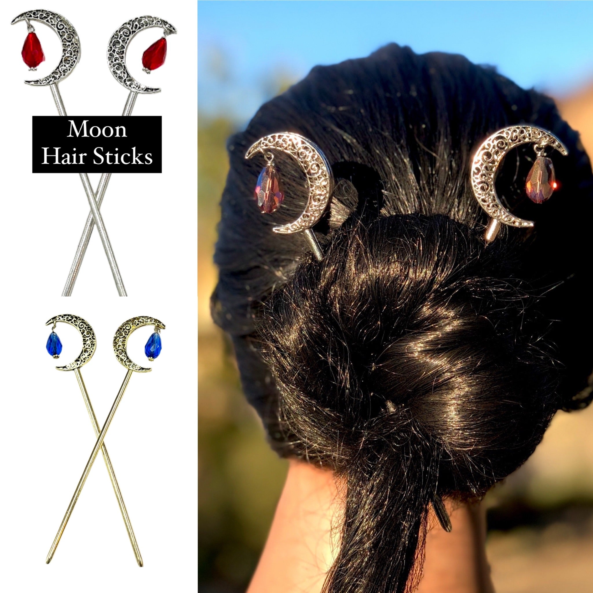 These hair sticks combine function and celestial charm, making them perfect for boho fashion, festival styles, or anyone who loves moon-inspired jewelry.